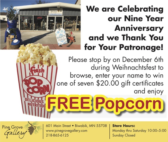 Wow we can't believe Pine Grove Gallery has been open nine years already! Jim and I want to thank all of our customers and friends for their continued patronage. We hope that if you are in Biwabik on December 6th, participating in the Weihnachtsfest festivities, that you stop in to say hello and grab some free popcorn. And also enter your name to win one of seven $20.00 gift certificates. We would love to see you!! Feel free to share to get the word out.